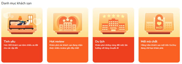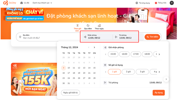 Khách hàng điền thông tin địa điểm muốn đi, ngày giờ nhận/trả phòng vào ô tìm kiếm Go2Joy.vn hoặc tìm phòng theo Danh mục khách sạn
