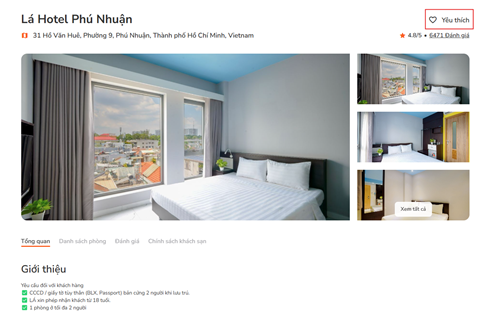 Thêm sản phẩm vào danh sách: Truy cập để xem thông tin khách sạn -> Nhấn vào biểu tượng trái tim để thêm vào mục “Danh sách yêu thích”
